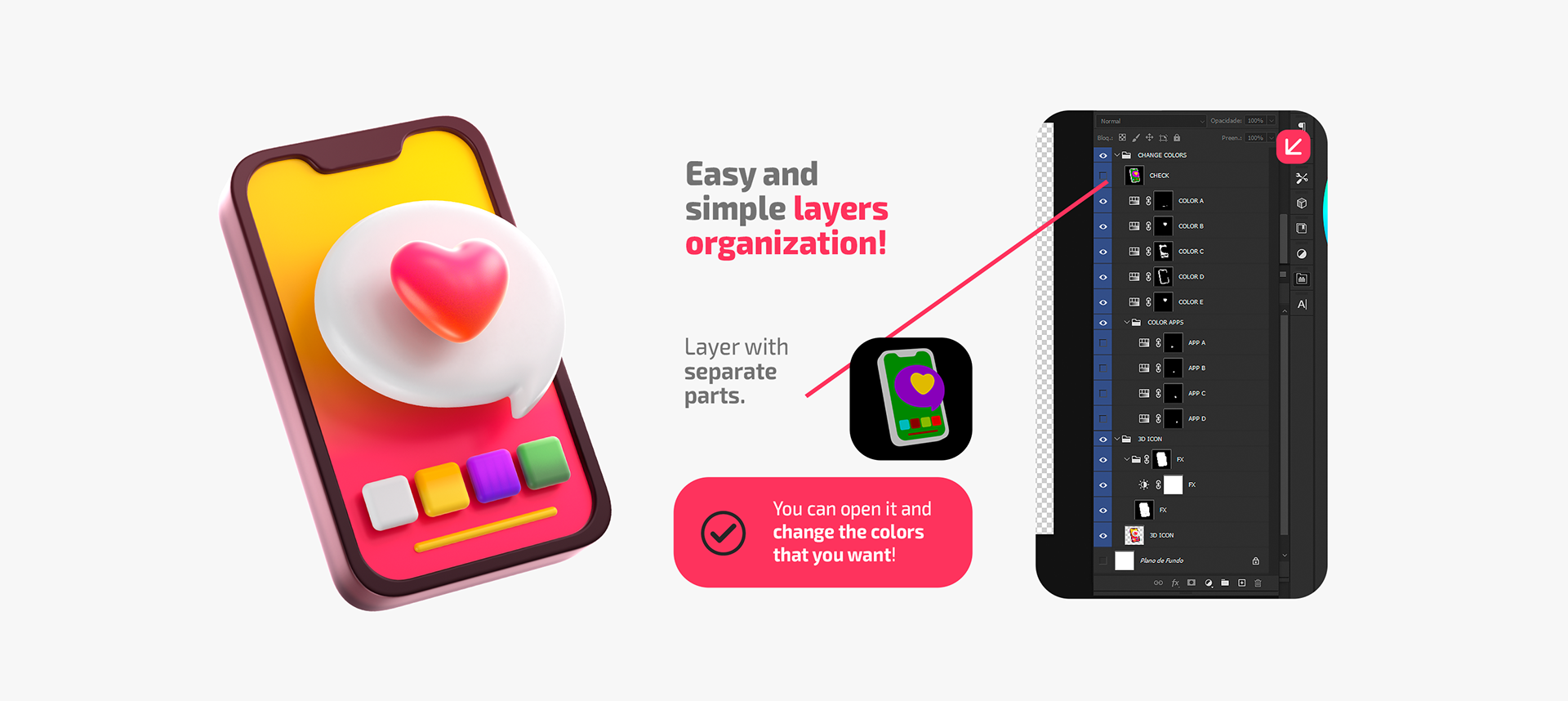 With organized layers separeted by folders and a layer with all parts of the icon separeted by colors.